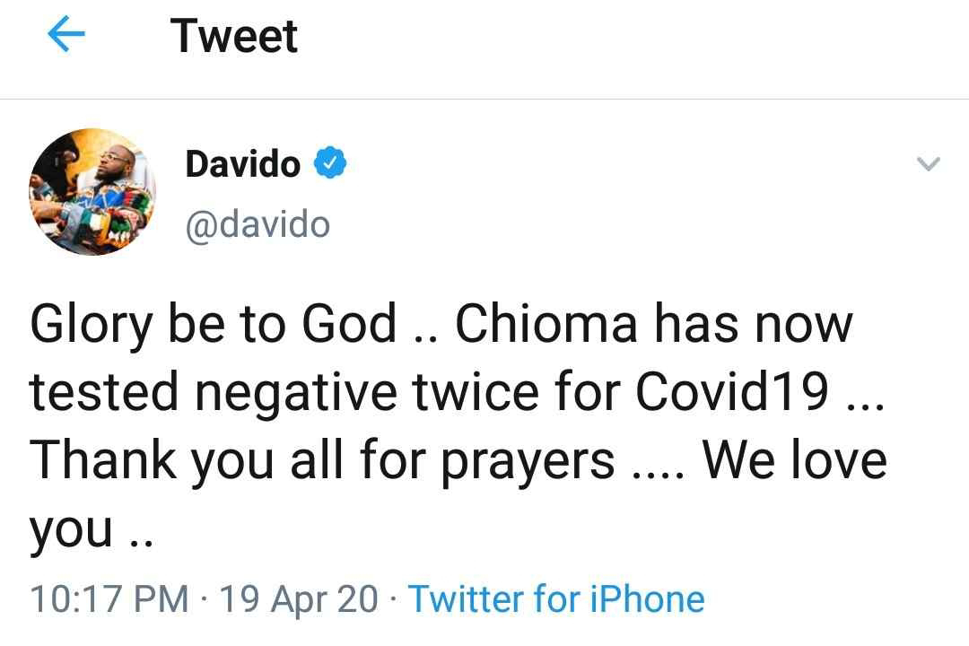 "Glory be to God ...Chioma has now tested negative twice for Covid19 ... Thank you all for prayers... We love you"